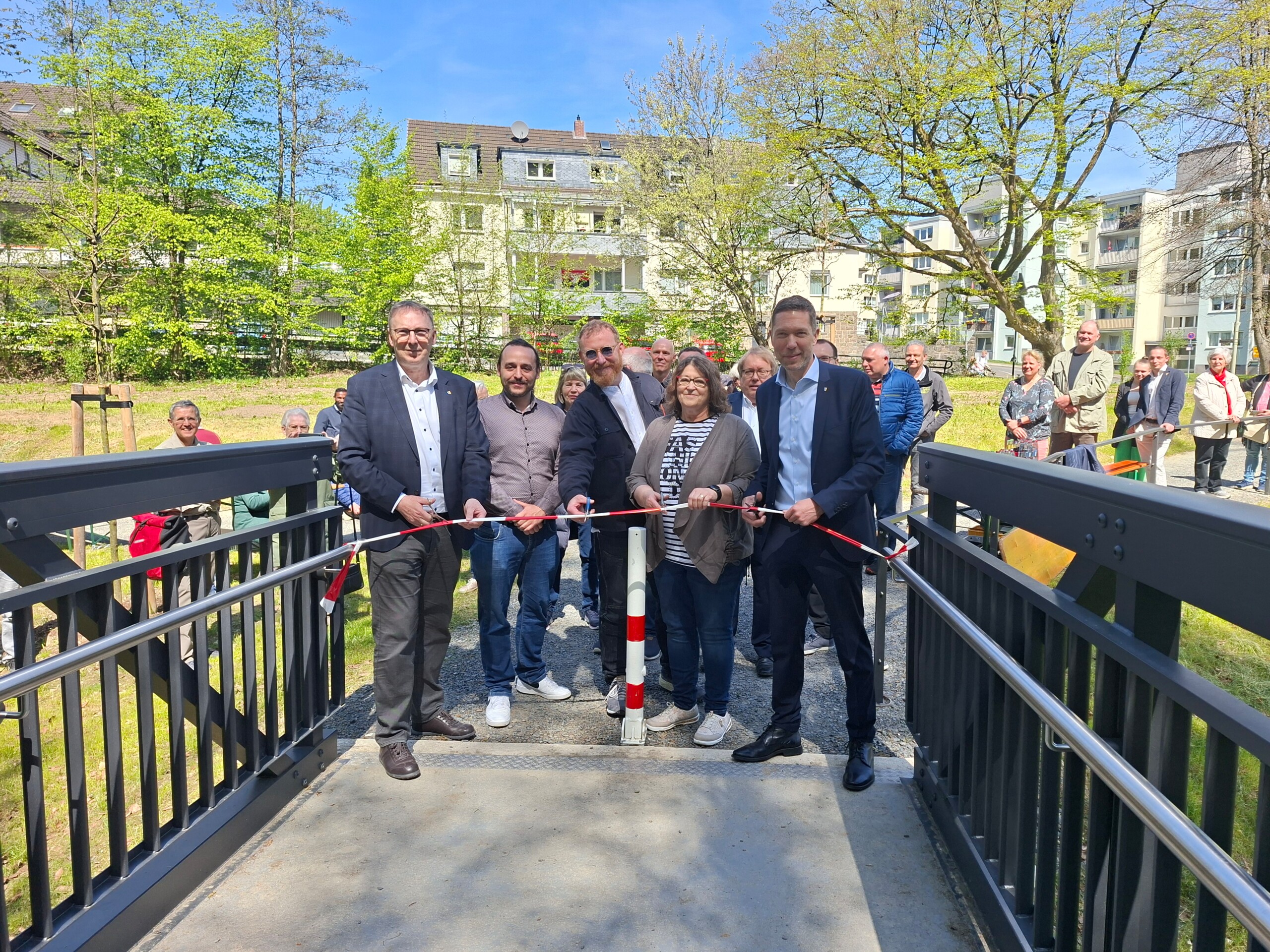 Am vergangenen Freitag, den 24.04.26, eröffnete Bürgermeister Raoul Halding-Hoppenheit zusammen mit dem Ersten und Technischen Beigeordneten Jürgen Hefner, dem Fachbereichs-leiter des Baubetriebshofs Dominik Siebers und dem Fachbereichsleiter des Gebäudemanage-ments Marc Böhnke den neu errichteten Hömicker Bachgarten in Gummersbach-Steinenbrück.