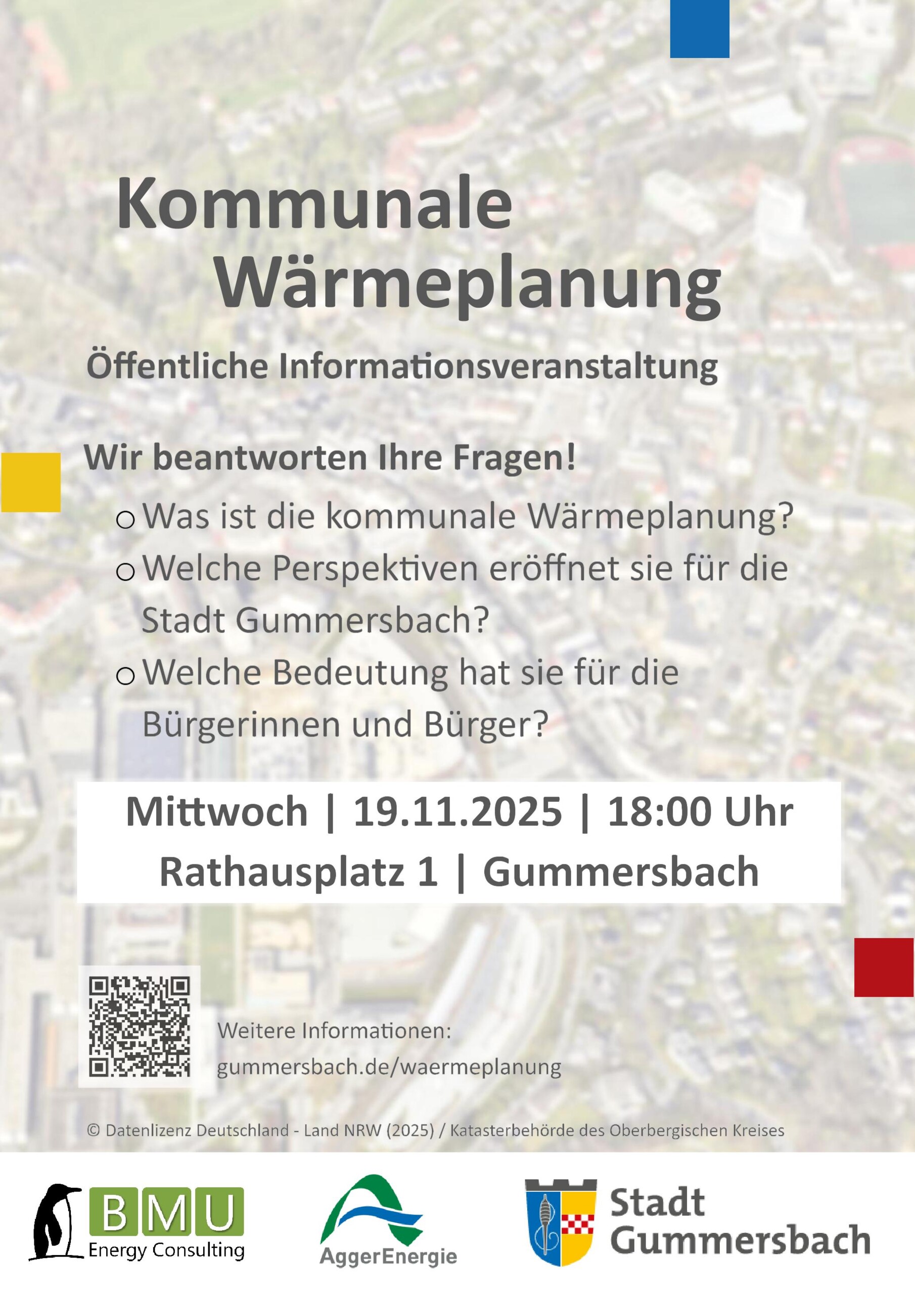 Die Stadt Gummersbach lädt alle Bürgerinnen und Bürger zu einer ersten Informationsveranstaltung zur kommunalen Wärmeplanung ein. Termin ist Mittwoch, der 19. November 2025, um 18:00 Uhr im Rathaus der Stadt Gummersbach. Gemeinsam mit der BMU Energy Consulting und der AggerEnergie werden Grundlagen, Ziele und voraussichtliche Auswirkungen der kommunalen Wärmeplanung vorgestellt.